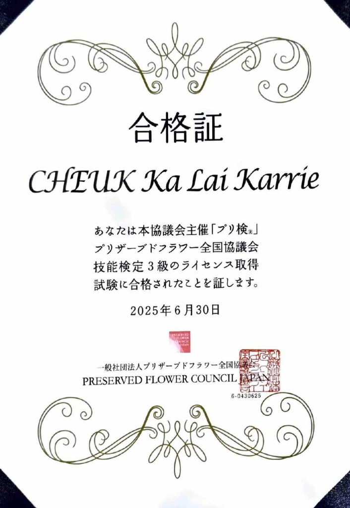 National Preserved Flower Council LV3 Certificate Japan 2025